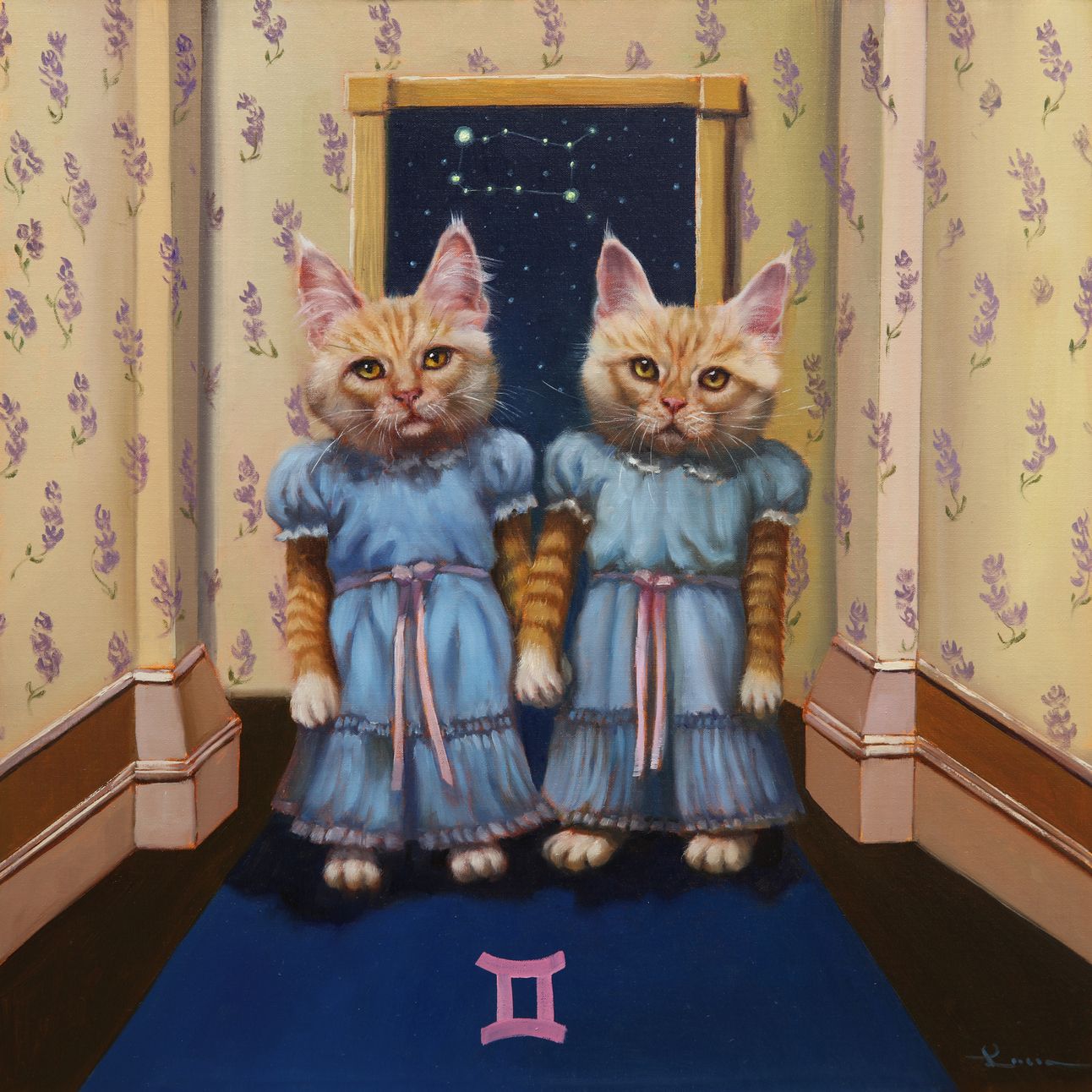 Speaking of scary movies, here are the twins from The Shining, part of a series of paintings based on the western Zodiac. (The original is available at Marine Arts Gallery.) I’m a dog person, but to hear my cat-owning friends talk, all cats are Geminis regardless of their birth month.