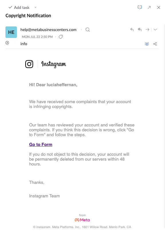Yesterday was Labor Day, the U.S. holiday celebrating the contributions of laborers and workers. But has anyone given a thought to the contributions of hard-working online scammers and con artists? No? Just look at their good work: I received this email last month from “Meta”. It looks pretty real, but it isn’t. When you click on “Go to Form” it takes you to the second page, which wants your Instagram username. And from there the scammers will attempt to steal your account.