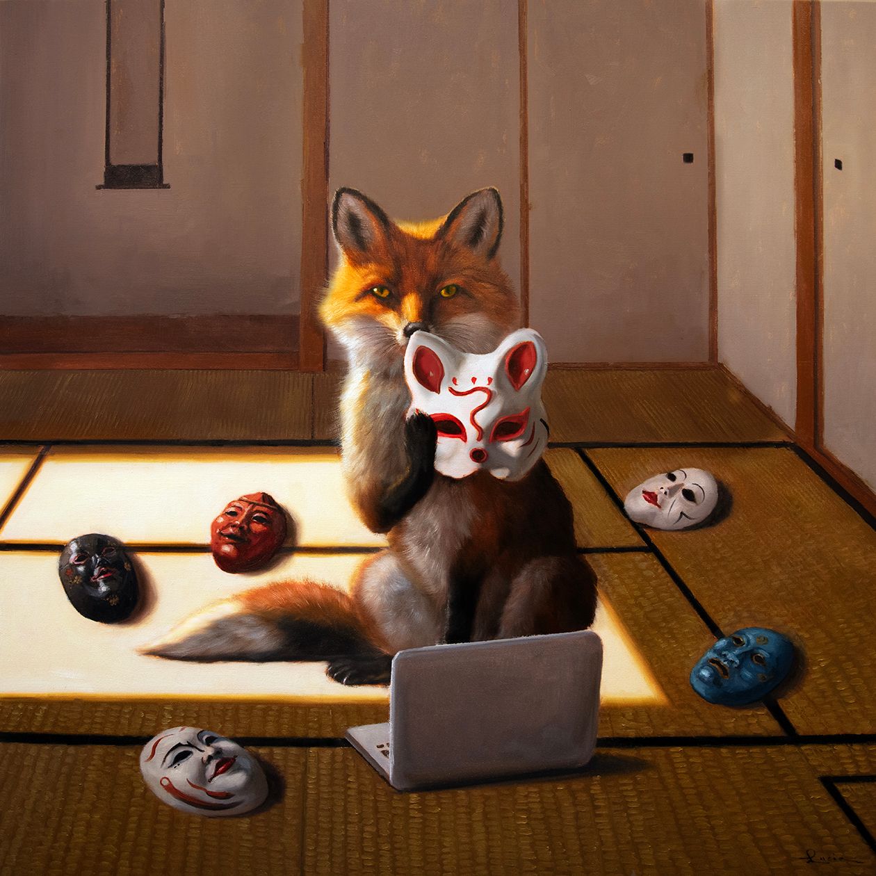 This character is based on Kitsune, a fox spirit in Japanese folklore who has the ability to shape-shift into human form and trick or fool human beings. “Identity Thief” will be on exhibit November 9-December 5, 2024 in the “Paracosmic Escape” International Exhibition at Modern Eden Gallery in San Fransisco. The exhibit is sponsored by Beautiful Bizarre Magazine.